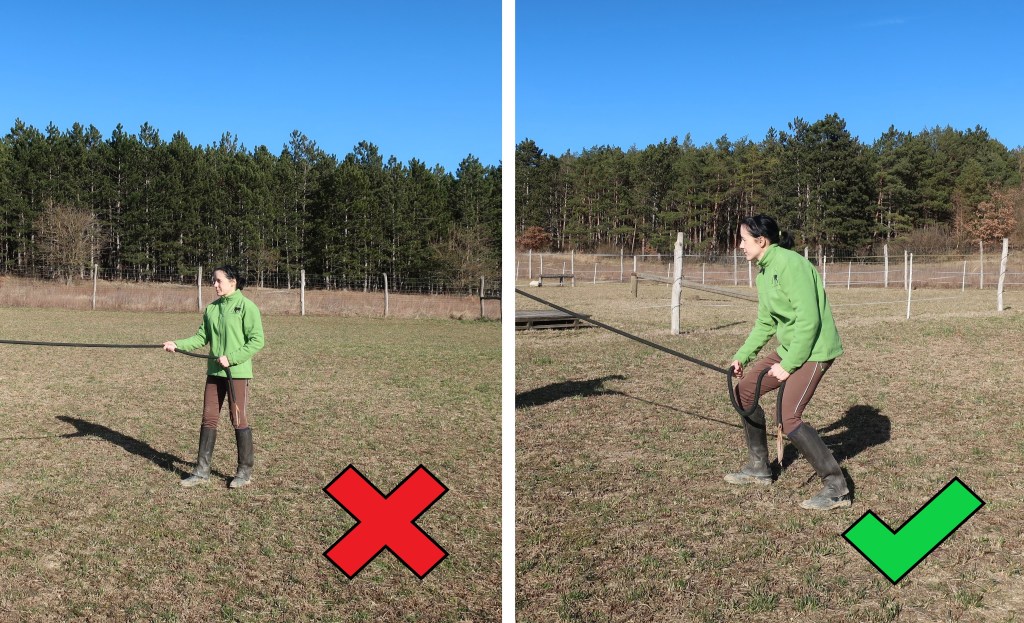 - Ninja állás: Ha már erősen kell fognunk a kötelet a kezünkben, mint ahogyan fent is leírtam, akkor ezt érdemes megerősítenünk egy stabil állással. Viccesen ninja állásnak hívom, mert nálam szinte mindennek van beceneve. A lényege, hogy ha egy ugrálós, kezünket rángatós lovat fogunk, ne csak álljunk, mint a villanyoszlop, hanem, álljunk közepes terpeszben, térdünket behajlítva, a kötelet fogó első kezünk lent, szinte a combunkon, a másikban pedig a végét fogjuk, hasonlóan hatékonyan, mint fent leírva, a másik combunkon. Kicsit görnyedhetünk is, hiszen így nem csak a comb, hátizmokat használjuk, hanem az egész vállövet, kart, és a hasizmokat is. Magyarán, mindent, célirányosan! Lehet, csak pár másodpercre kell megtartanunk egy delikvenst, viszont ha ez nem sikerül, akkor öngólt kaptunk! Ne feledjük, a lovak minden cselekedetünket figyelik, és arra várnak, mikor hibázunk. Ne hibázzunk. Ha kell, és a helyzet valóban megköveteli, vegyük fel a ninja helyzetet!