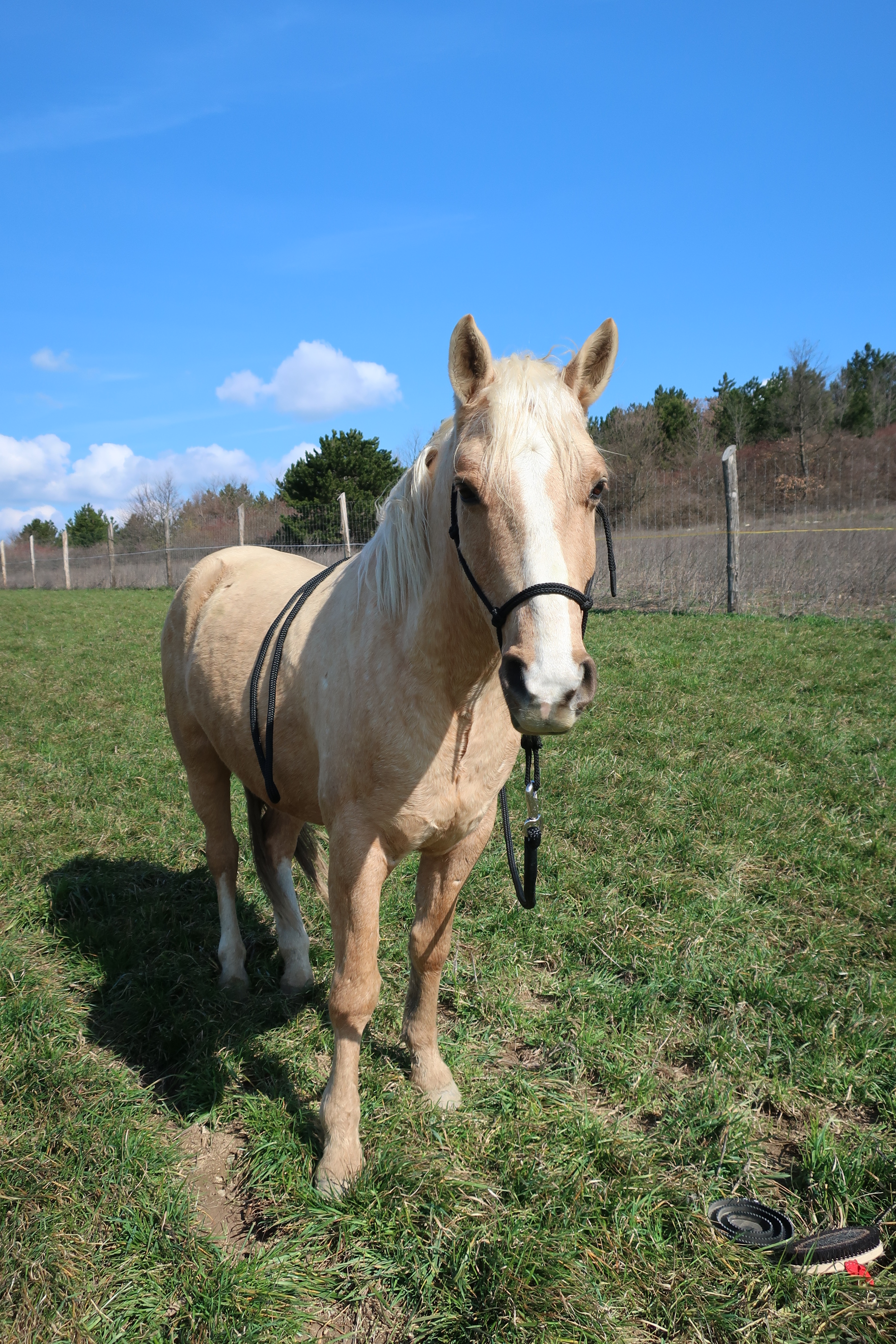 Seine Abstammung ist nicht ganz geklärt, aber laut dem alten Eigentümer steckt in ihm teilweise ein Araber und Akhal Teke. Die Merkmale vom Letzteren kann man leicht an seinem goldenen Glanz und angenehmen Rücken sehen. Ihn habe ich wegen seinem Alter und ruhiger Persönlichkeit gewählt, da er mir bei Reitunterrichten von Kindern und Therapiereiten helfen wird. Bis daher muss ich ihn noch etwas ausbilden, da man bist jetzt mit ihm nicht intensiv gearbeitet hat. Ich habe ihn am 31. März, 2018 geholt, und ich habe schon mit seiner Ausbildung angefangen.